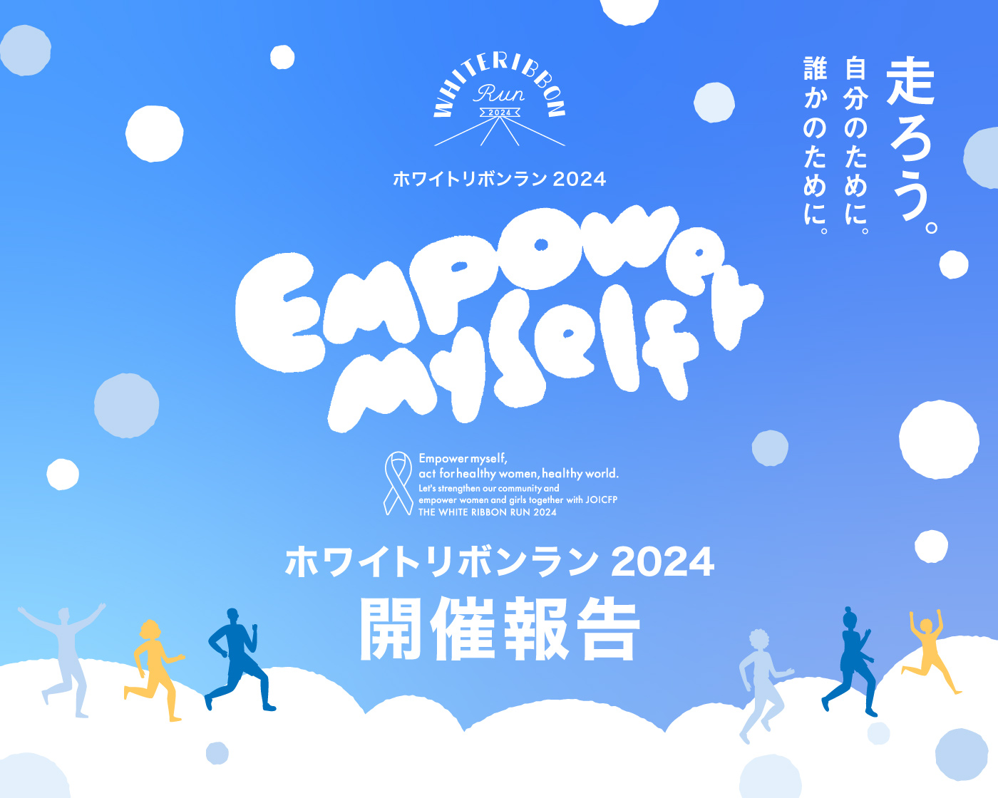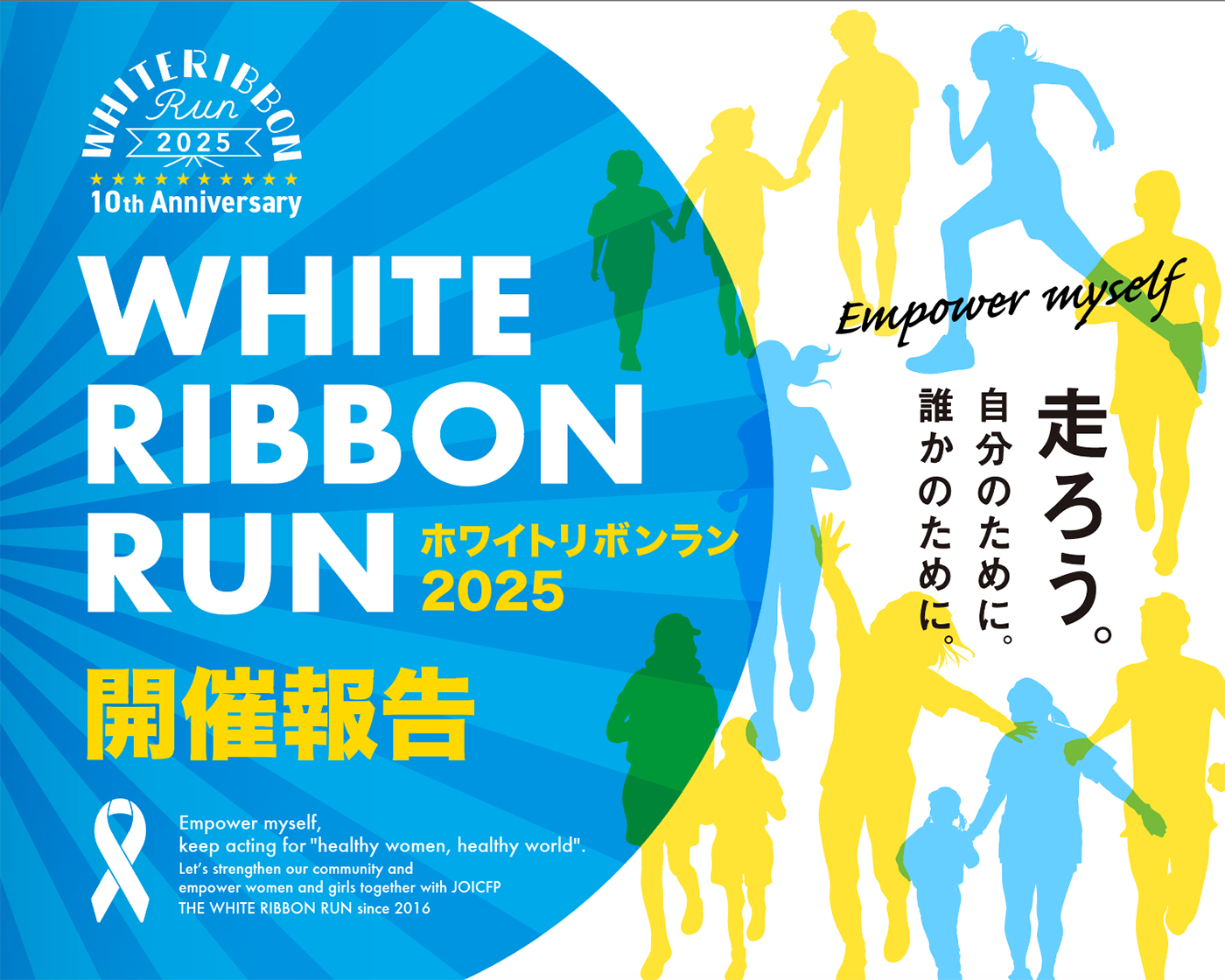 3月8日の国際女性デーに向けて、「女性の健康と権利」の大切さを伝えるホワイトリボンの願いを胸に、海外・日本の全国各地で一斉にアクションをするチャリティラン「ホワイトリボンラン2025」を開催しました。2016年の第1回大会から数えて10回目の本大会は、「走ろう。自分のために。誰かのために。」このスローガンに賛同し、全国のボランティアが運営する拠点ランニングとホワイトリボン月間(3月1日~31日)に何度でもアクションできるバーチャルランニングと、2種類の参加方法から、多くの皆さまに参加いただきました。